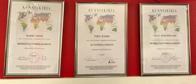 Kaikilla mekaanikoillamme on erikoiskoulutuksen jälkeen suoritettuna auto-mekaanikon ammattitutkinto